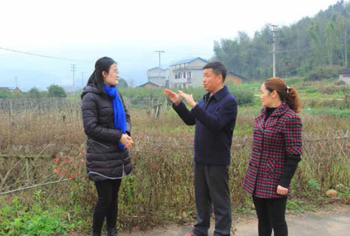 林善平代表(中)走訪回鄉的大學畢業生施穎( 左一),鼓勵她紮根山區,為山區發展貢獻聰明才智。攝影/ 王爭