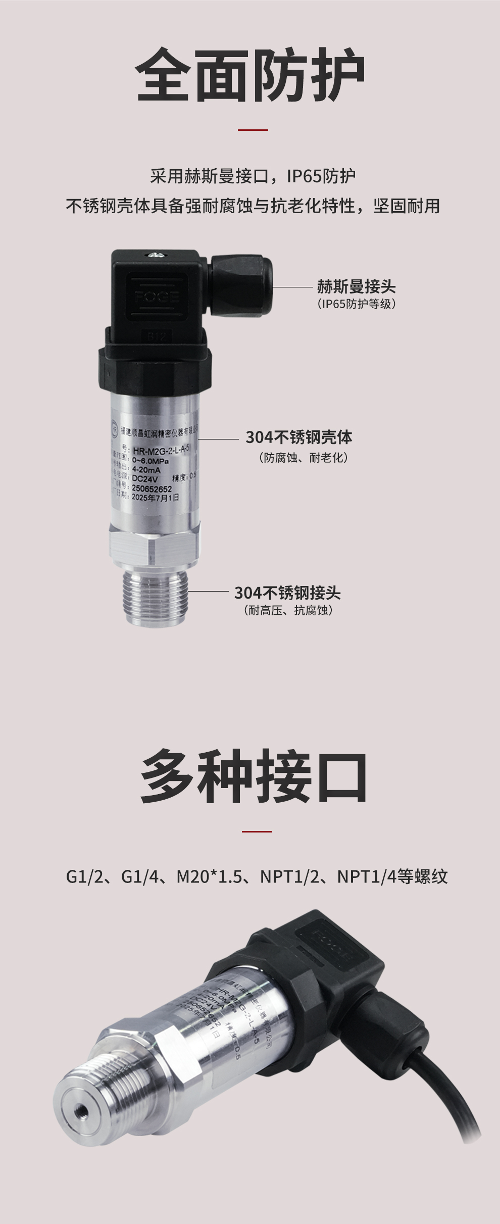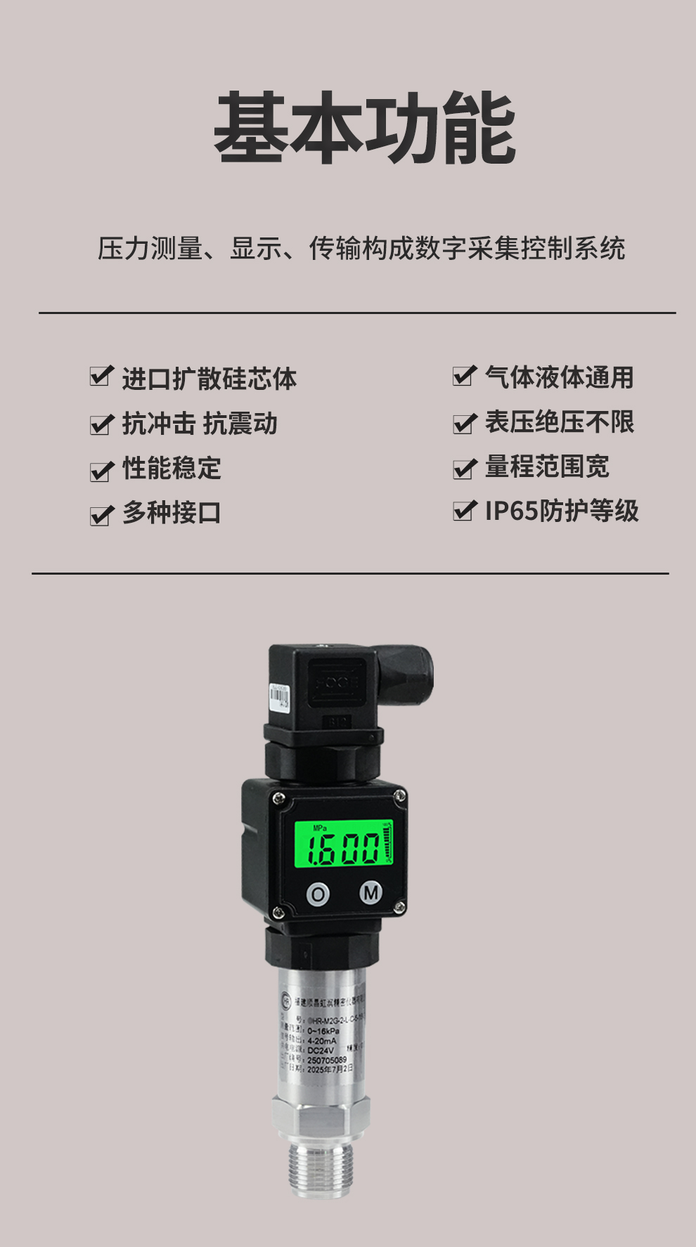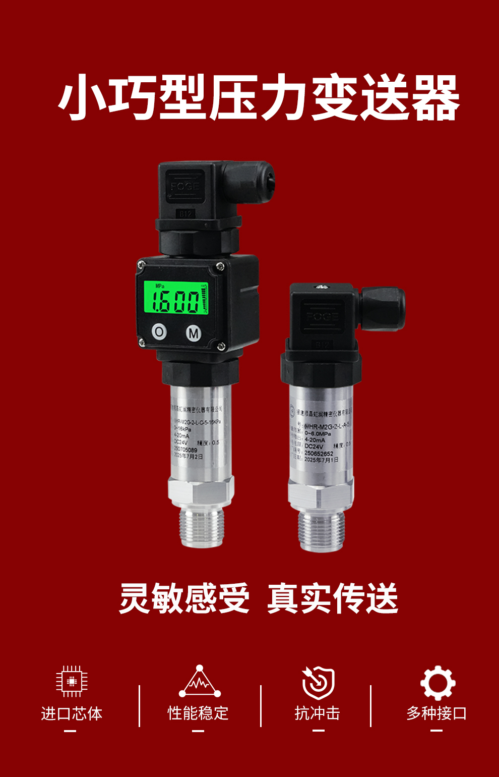虹潤公司是專業生產壓力變送器的國家專精特新“小巨人”企業,生產的小巧型壓力變送器,具有采用進口芯體,量程範圍寬,抗衝擊抗震動,多種螺紋接口,性能穩定等特點。產品獲得一種數字顯示低功耗壓力表、一種信號發生器裝置等2項國家發明專利,主持起草工業過程控製係統用模擬輸入兩位或多位輸出儀表、工業過程測量和控製係統用壓力/差壓變送器等2項國家標準,通信係統多通道數據采集控製終端規範軍用標準,以及現場設備集成等5項智能製造國家標準,參與國際5G標準製定,取得數顯壓力表等2項相關軟件著作權。產品廣泛應用於化工、食品、製藥、電力、設備配套、供暖、水處理、樓宇等行業,需精準測量流體壓力的現場。
