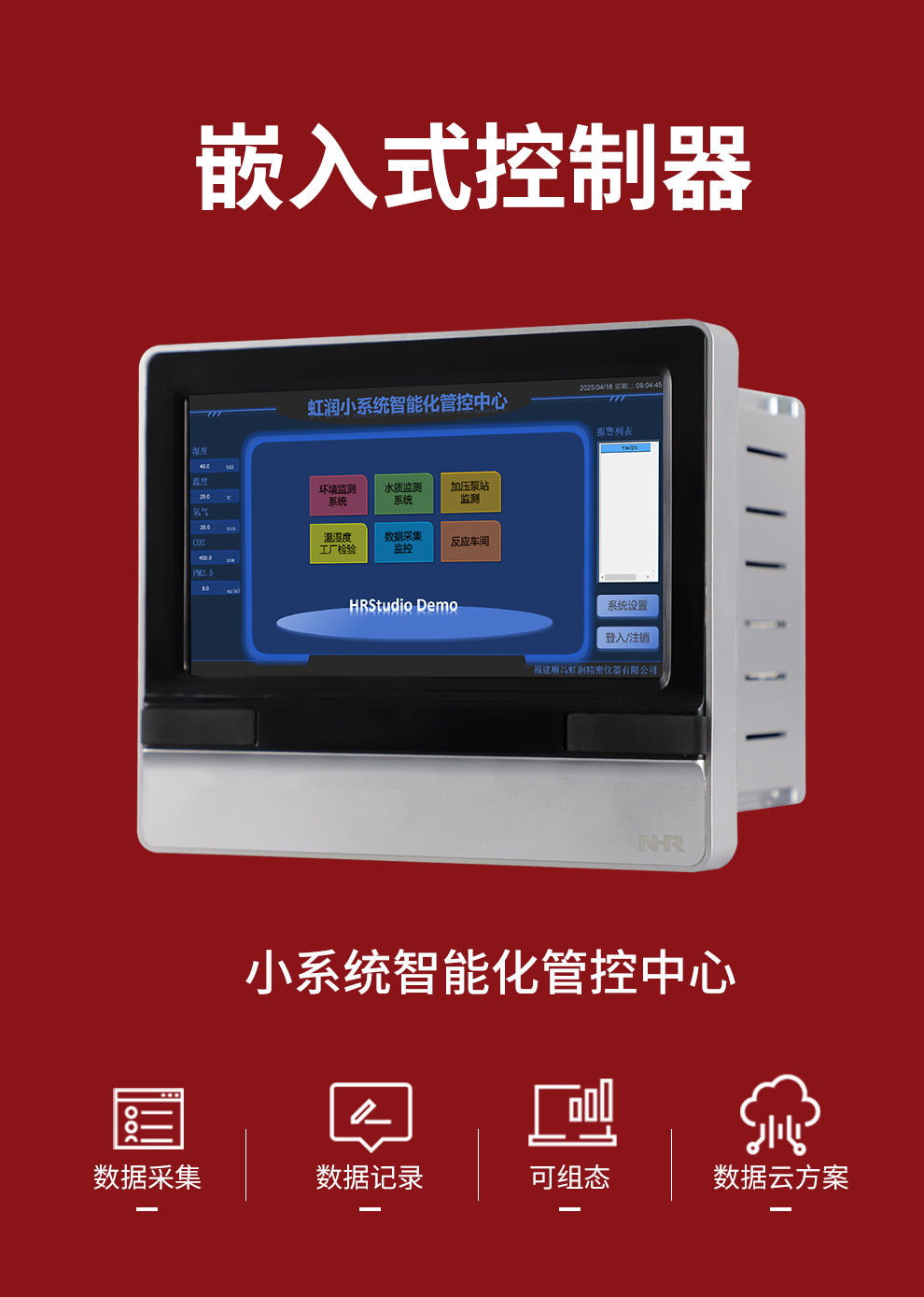 虹潤公司是專業生產觸摸屏的國家專精特新“小巨人”企業。生產的嵌入式控製器,具有數據采集與記錄,內置與外配組態軟件,數據雲方案,RS485/以太網通訊等特點。產品獲得嵌入式數據采集工作站組網係統、數據采集工作站、無紙記錄儀、智能化控製器、巡回檢測顯示方法及裝置等5項國家發明專利;主持起草通信係統多通道數據采集控製終端規範軍用標準,物聯網智能記錄儀表通用技術條件國家標準,以及空間數據與信息數據傳輸係統等2項航天標準,參與國際5G標準製定;取得嵌入式數據采集控製工作站以及HRStudio畫麵組態軟件等4項相關軟件著作權。產品廣泛應用於航天航空、化工、冶金、製藥、設備配套、現代農業、環境監測等諸多領域。