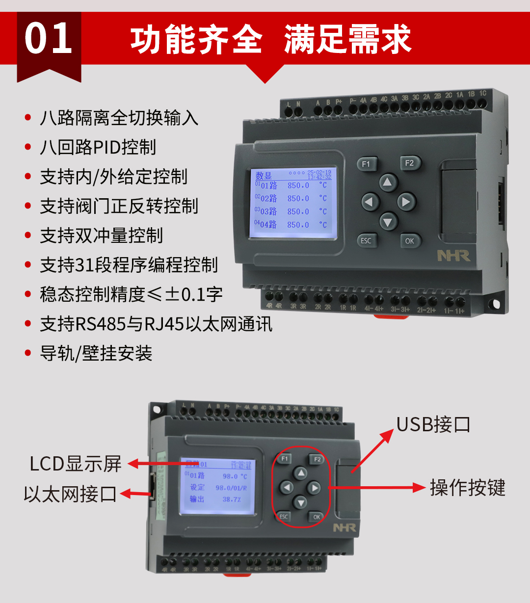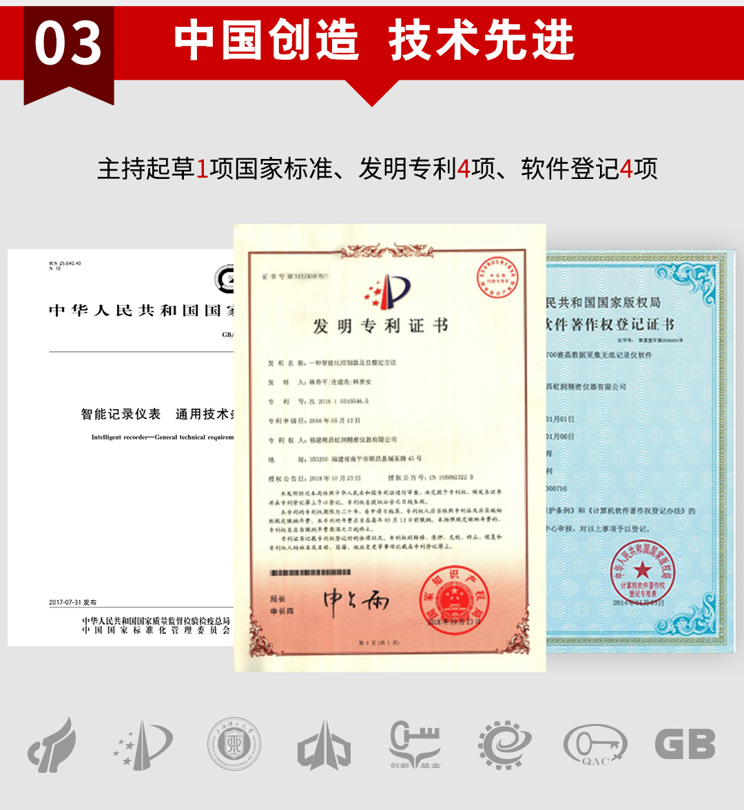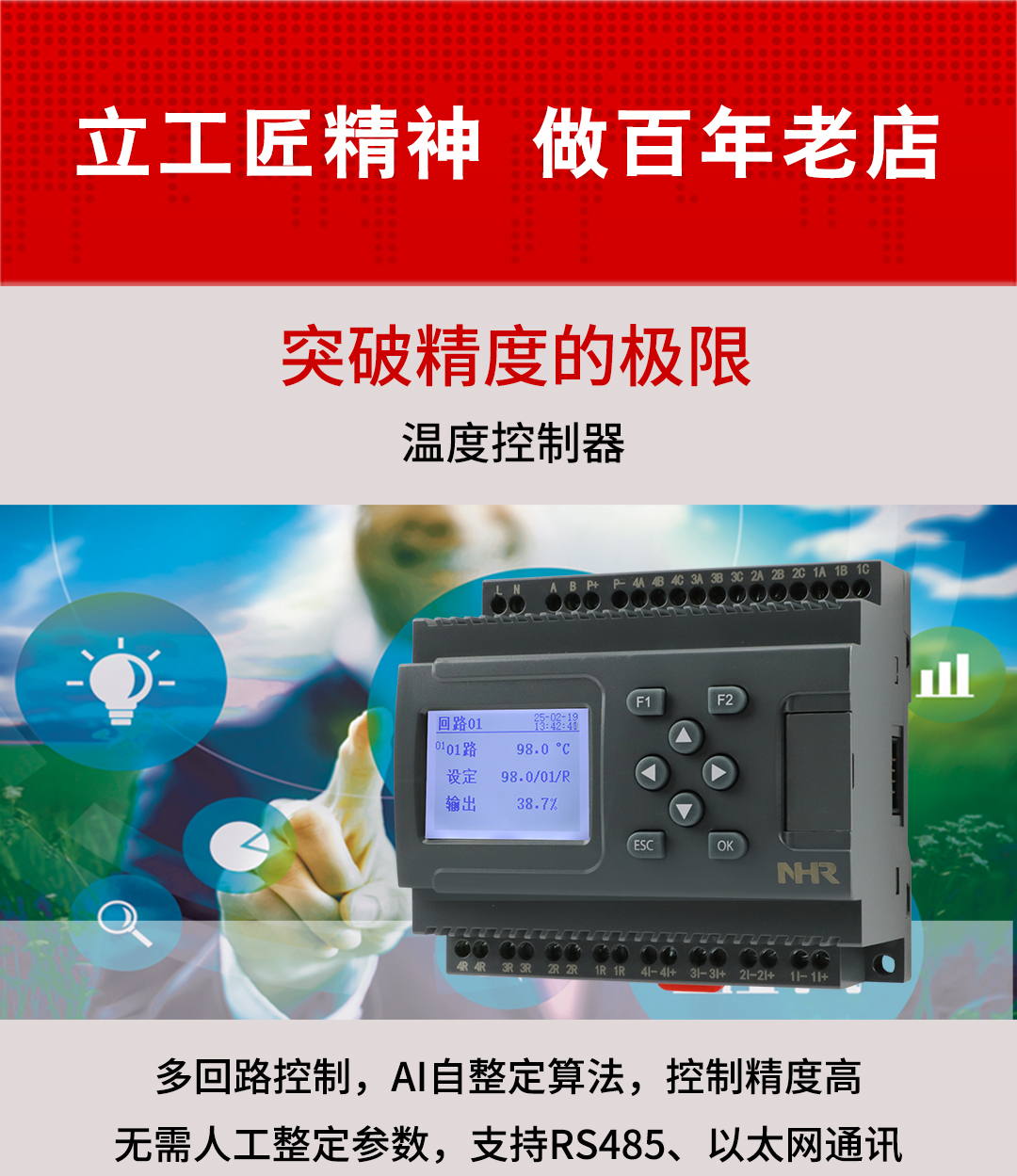 虹潤公司是專業生產溫控器的國家專精特新“小巨人”企業。生產的溫度控製器,具有4路或8路PID控製,真正人工智能算式,無需人工整定參數,控製精度達士0.1°C,數據記錄與轉存等特點。產品獲得智能化控製器、人工智能調節器及調節方法、模糊PID控製儀及控製方法、一種平板無紙記錄儀、巡回檢測顯示方法及裝置等5項國家發明專利,主持起草物聯網智能記錄儀表、物聯網智能溫度儀表、工業過程測量和控製係統用智能調節器等3項國家標準,參與國際5G標準製定,取得液晶溫控器儀表等3項相關軟件著作權。產品廣泛應用於電石化、工業爐、試驗設備、注塑機械、包裝機械等需要對現場溫度進行監測控製的行業。