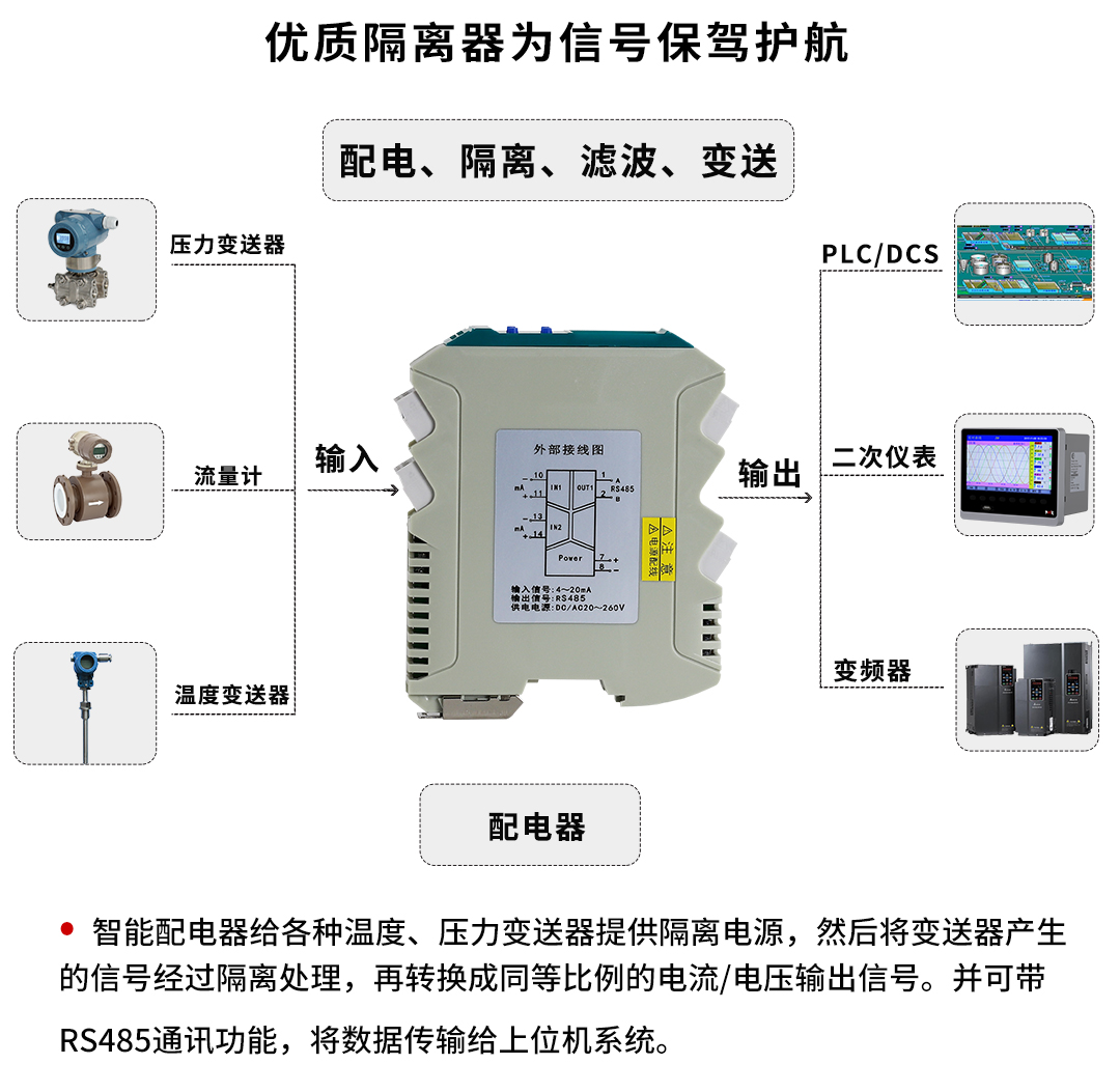 虹潤公司是專業生產隔離器的國家專精特新“小巨人”企業。生產的導軌式智能配電器,具有配接二三線製變送器,輸入輸出電源三隔離,響應時間快,傳輸精度0.1%FS,支持485通訊輸出等特點。產品獲得信號隔離器、一種二端子模塊、無源信號隔離器等3項國家發明專利,主持起草現場設備工具(FDT)接口規範、工業過程測量和控製係統用隔離式安全柵、工業過程測量和控製係統用配電器等3項國家標準,以及通信係統多通道數據采集控製終端規範軍用標準。參與國際5G標準製定。,取得智能隔離器等2項相關軟件著作權。產品廣泛應用於石油、化工,冶金、電力、食品、光伏能源、汙水處理等需要電隔離的工業自動化控製係統。