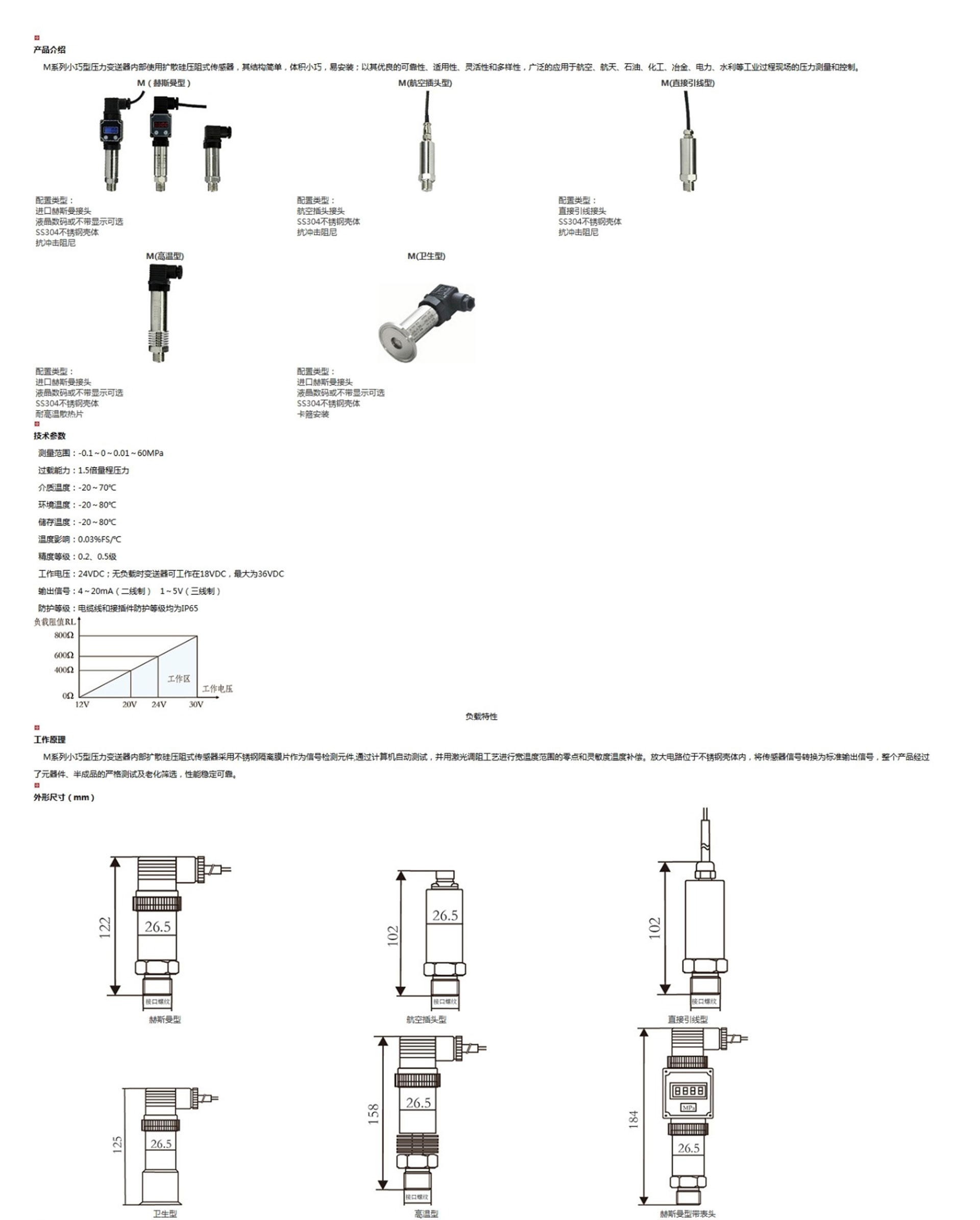 M係列小巧型壓力變送器內部使用擴散矽壓阻式傳感器,其結構簡單,體積小巧,易安裝;以其優良的可靠性、適用性、靈活性和多樣性,廣泛的應用於航空、航天、石油、化工、冶金、電力、水利等工業過程現場的壓力測量和控製。