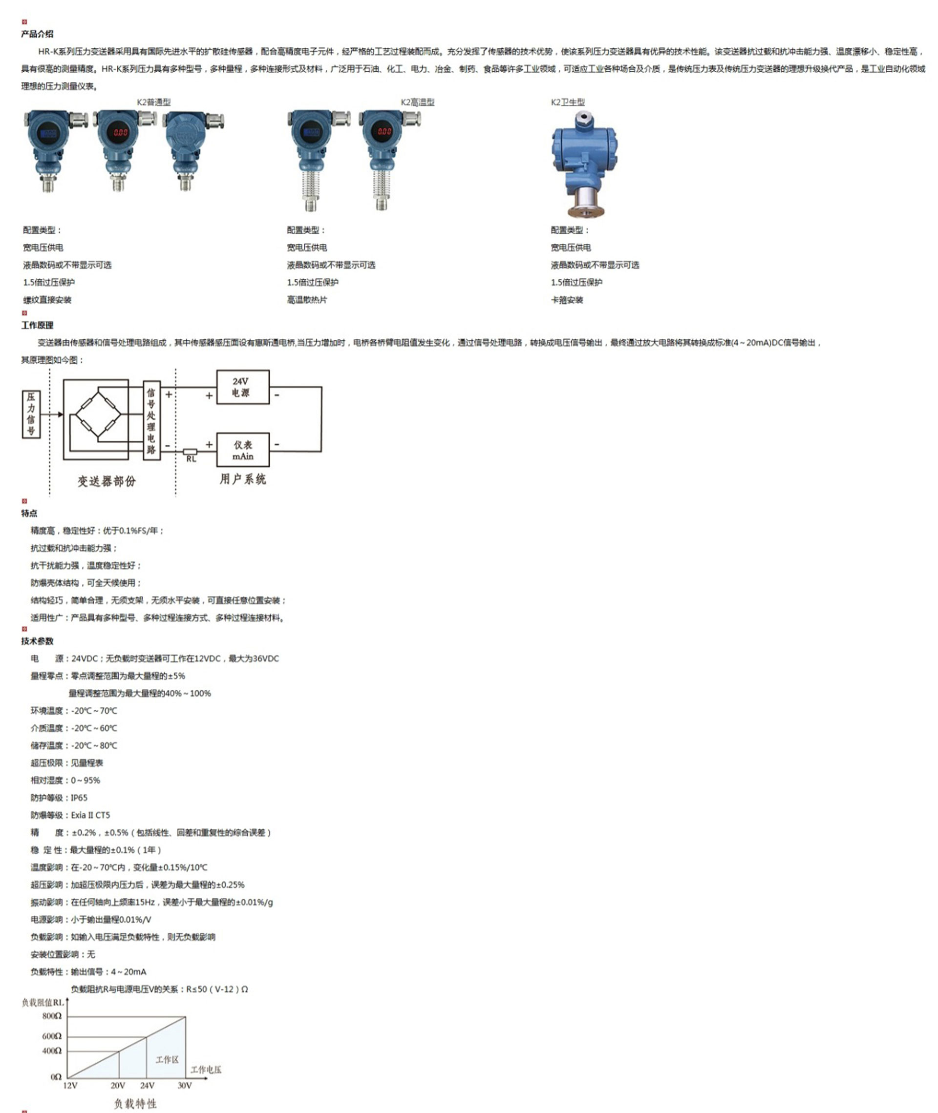 HR-K係列壓力變送器采用具有國際先進水平的擴散矽傳感器,配合高精度電子元件,經嚴格的工藝過程裝配而成。充分發揮了傳感器的技術優勢,使該係列壓力變送器具有優異的技術性能。該變送器抗過載和抗衝擊能力強、溫度漂移小、穩定性高,具有很高的測量精度。