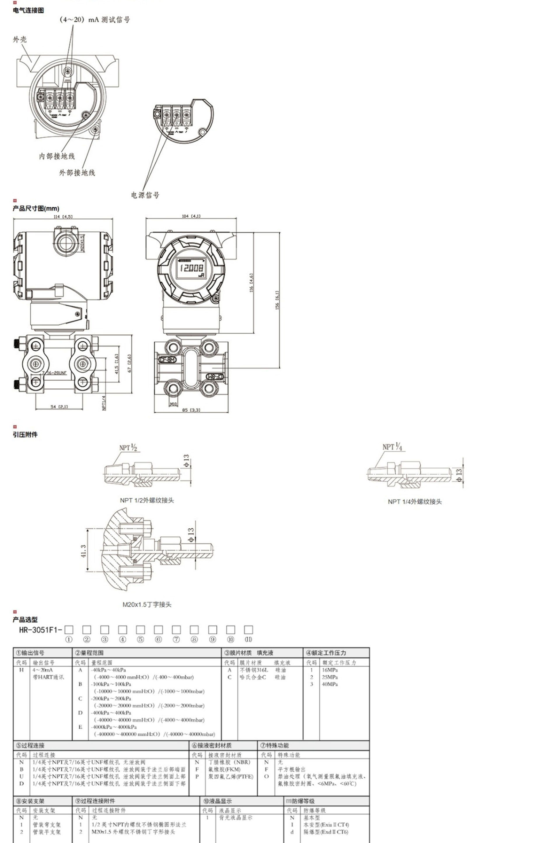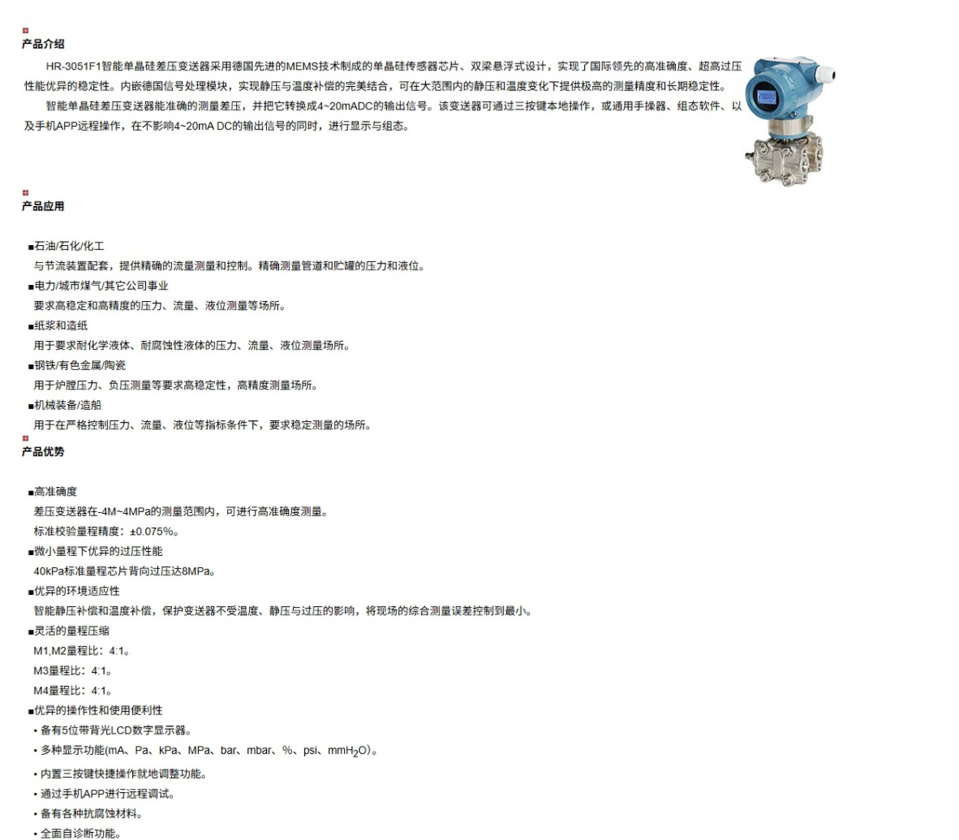 HR-3051F1智能單晶矽差壓變送器能準確的測量差壓,並把它轉換成4~20mADC的輸出信號。該變送器可通過三按鍵本地操作,或通用手操器、組態軟件、以及手機APP遠程操作,在不影響4~20mA DC的輸出信號的同時,進行顯示與組態。