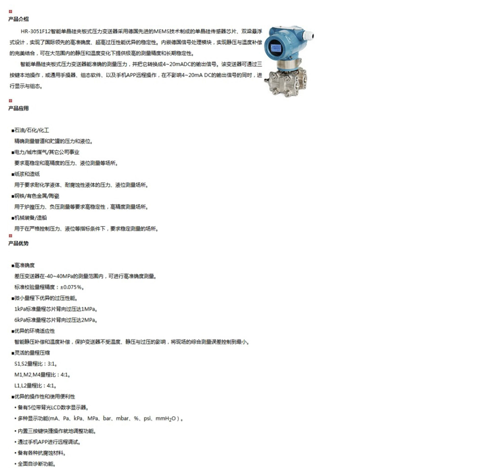 HR-3051F12智能單晶矽夾板式壓力變送器能準確的測量壓力,並把它轉換成4~20mADC的輸出信號。該變送器可通過三按鍵本地操作,或通用手操器、組態軟件、以及手機APP遠程操作,在不影響4~20mA DC的輸出信號的同時,進行顯示與組態。
